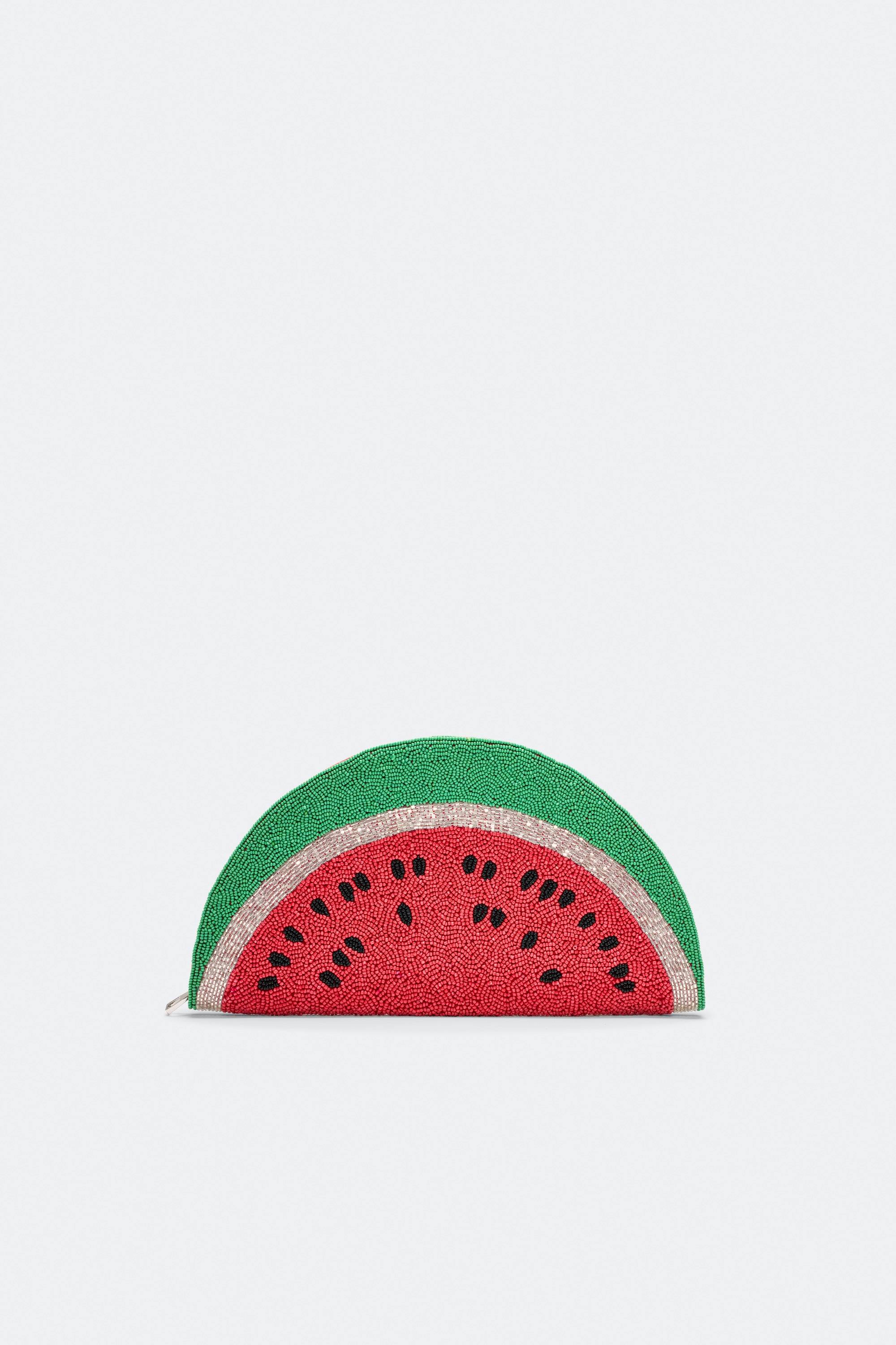 Hand-beaded clutch featuring intricate glass beads arranged in a playful watermelon motif. Designed in our signature Lune silhouette for a bold, collectible finish.