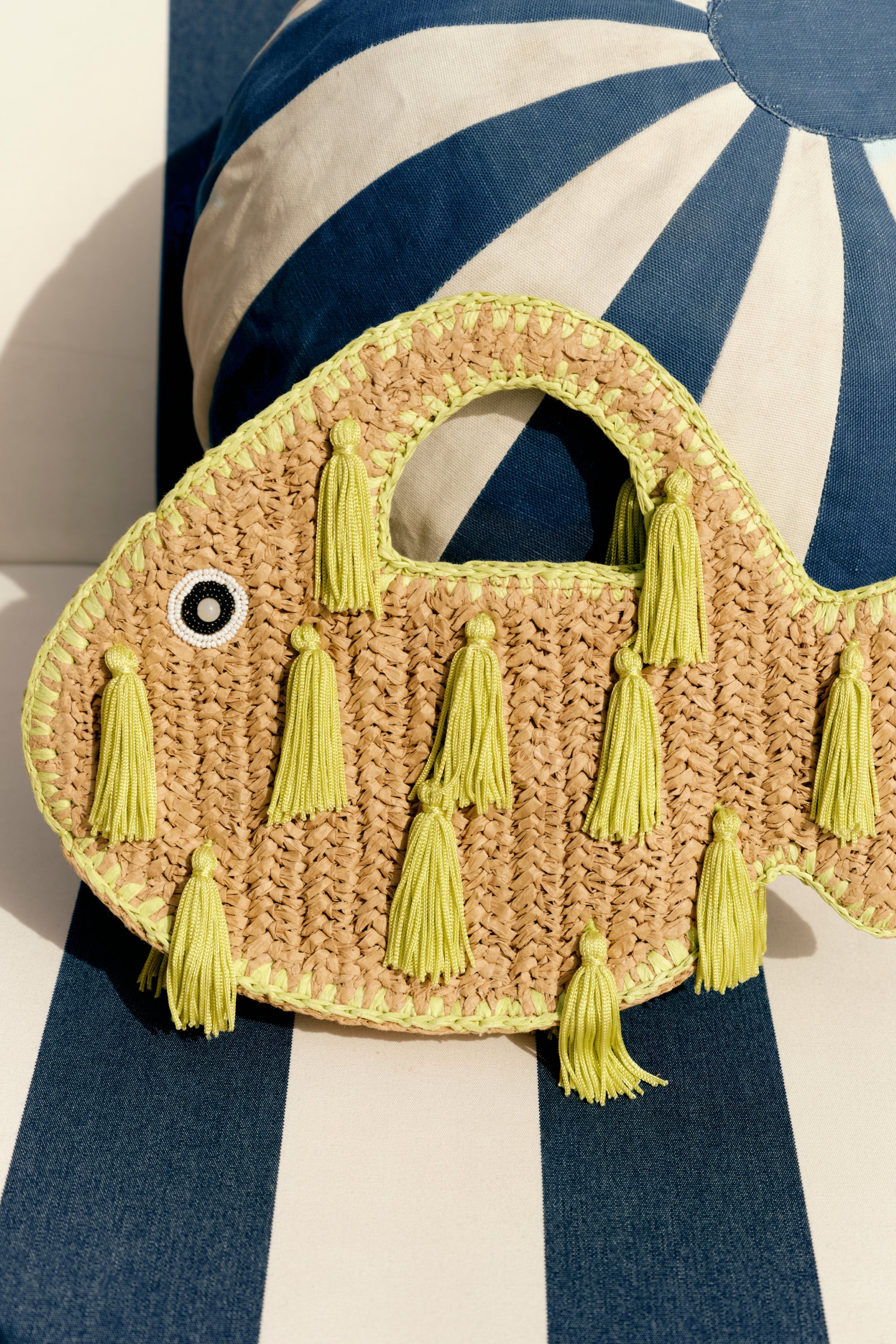 Raffia handbag crafted in a playful fish shape with seed-beaded eye detailing and green hanging tassels throughout the body. A magnetic closure keeps essentials secure while adding a refined finish.