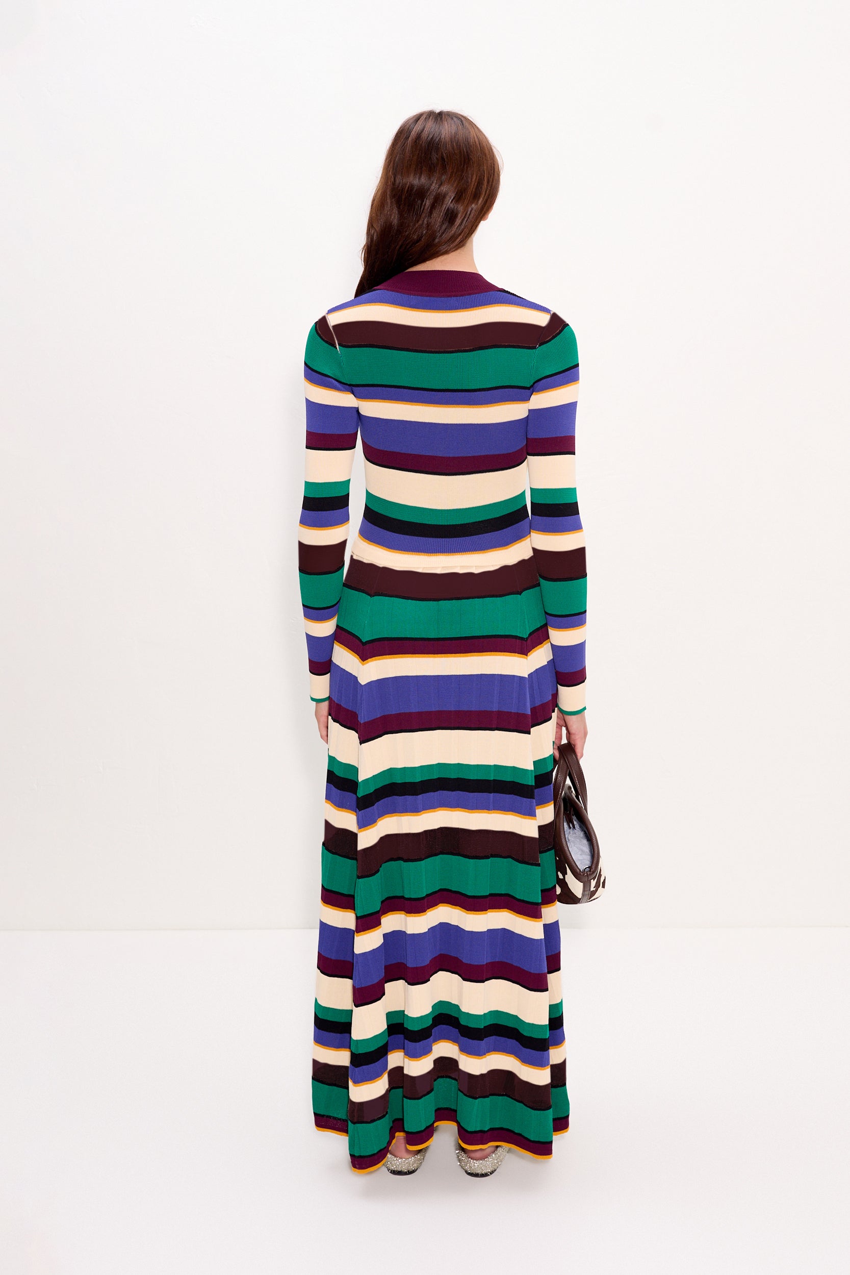 Maxi-length long sleeve knit dress featuring multicolor tropical stripes. Designed with a fitted bodice and pleated skirt for a flattering drape below the waist.
