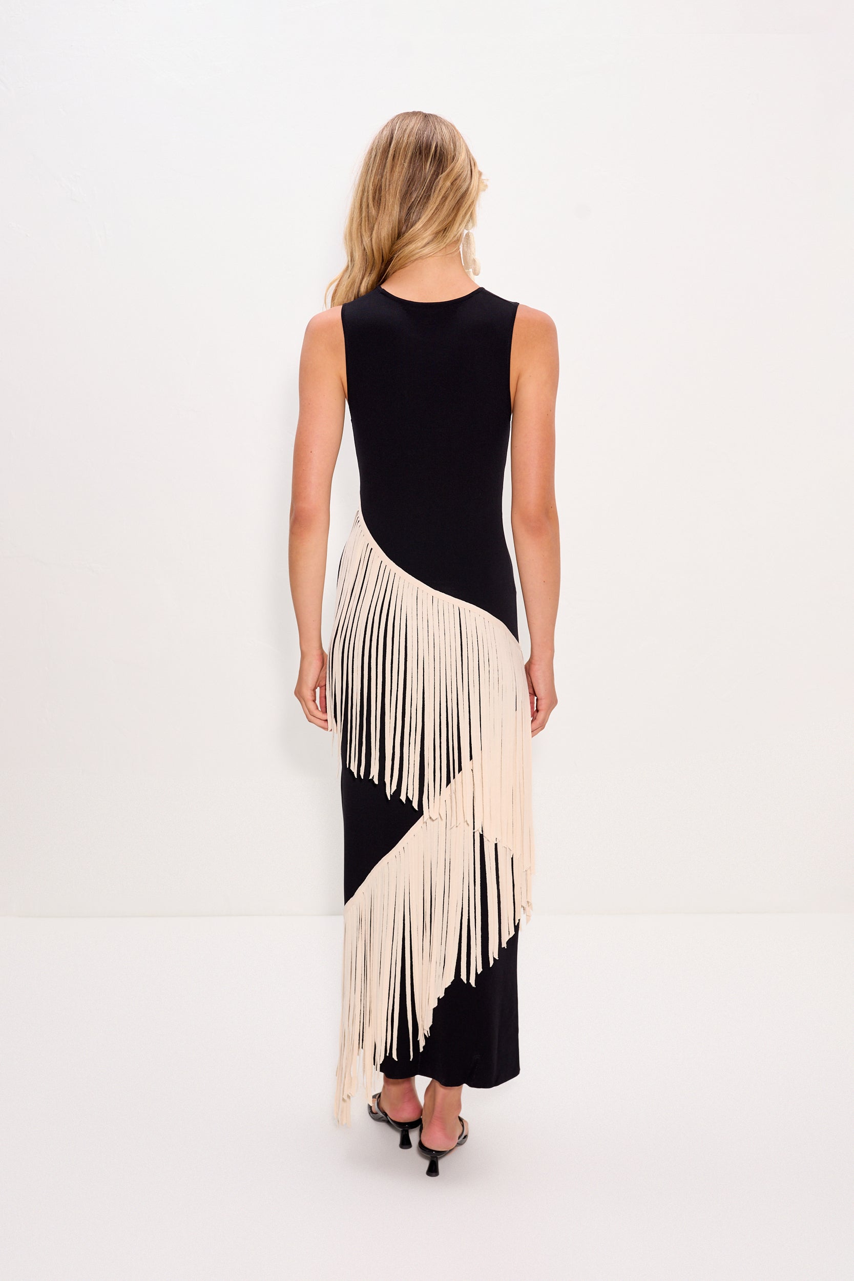 Long knit dress in black and macadamia with a body-skimming silhouette. Features a spiral striped pattern and lightweight stretch for an easy, flattering fit.