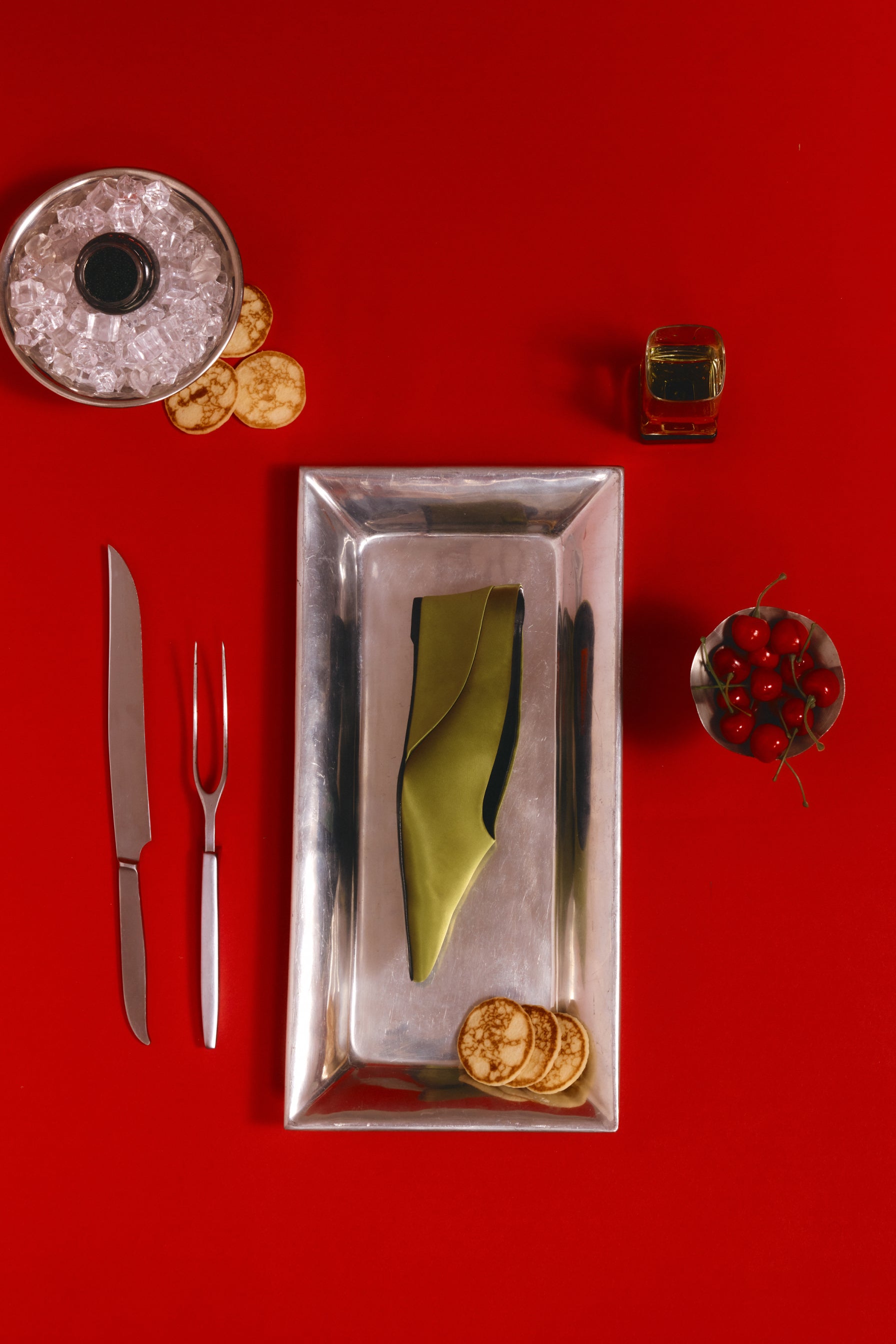 Closed-toe pointed wedge mule in moss satin. Features a sleek sculptural silhouette with a smooth finish and subtle sheen.