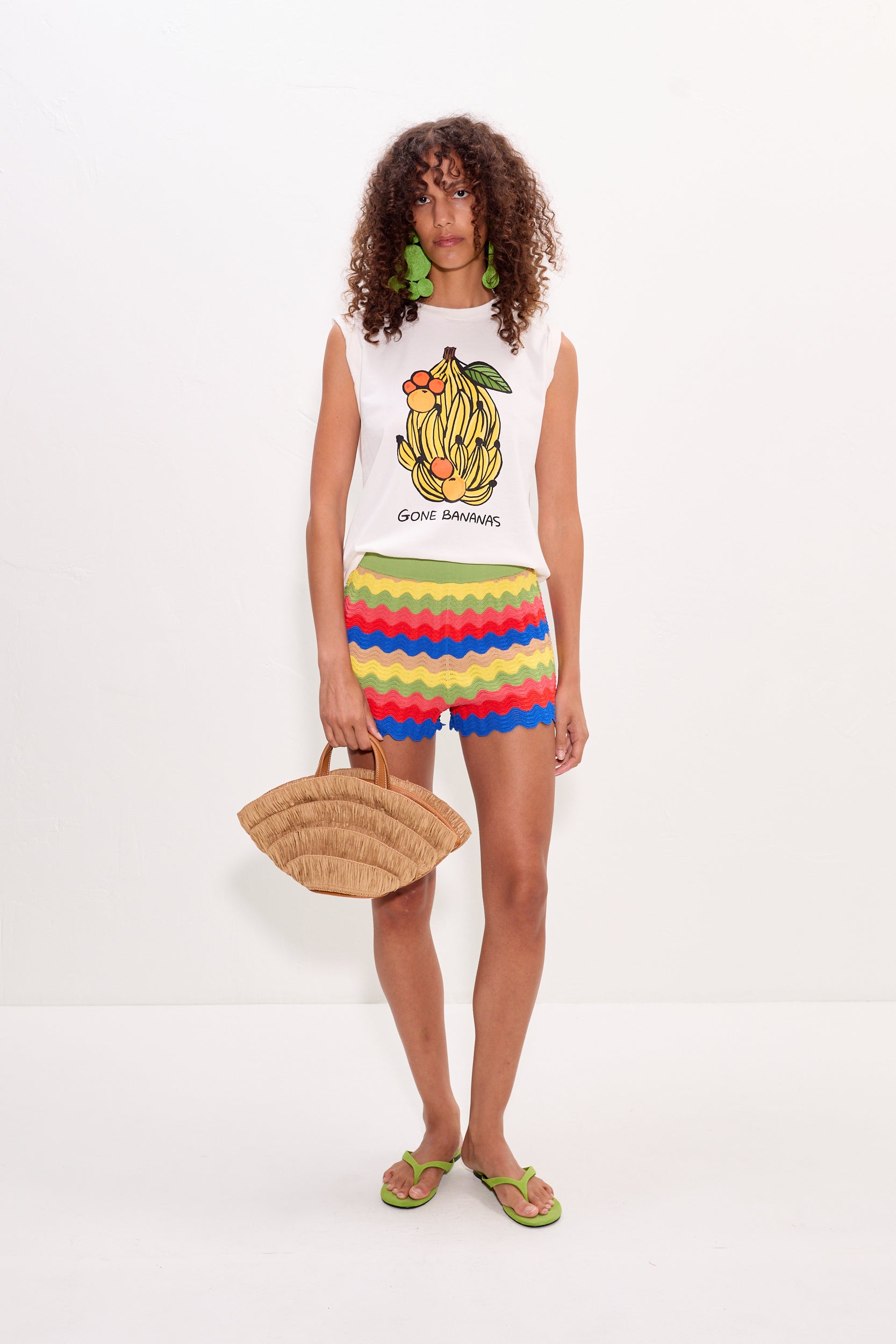 Mid-rise fitted knit shorts crafted in a soft pointelle stitch knit. Designed with colorful wavy stripes, a contrast waistband and hem, and a pull-on construction for easy, comfortable wear.