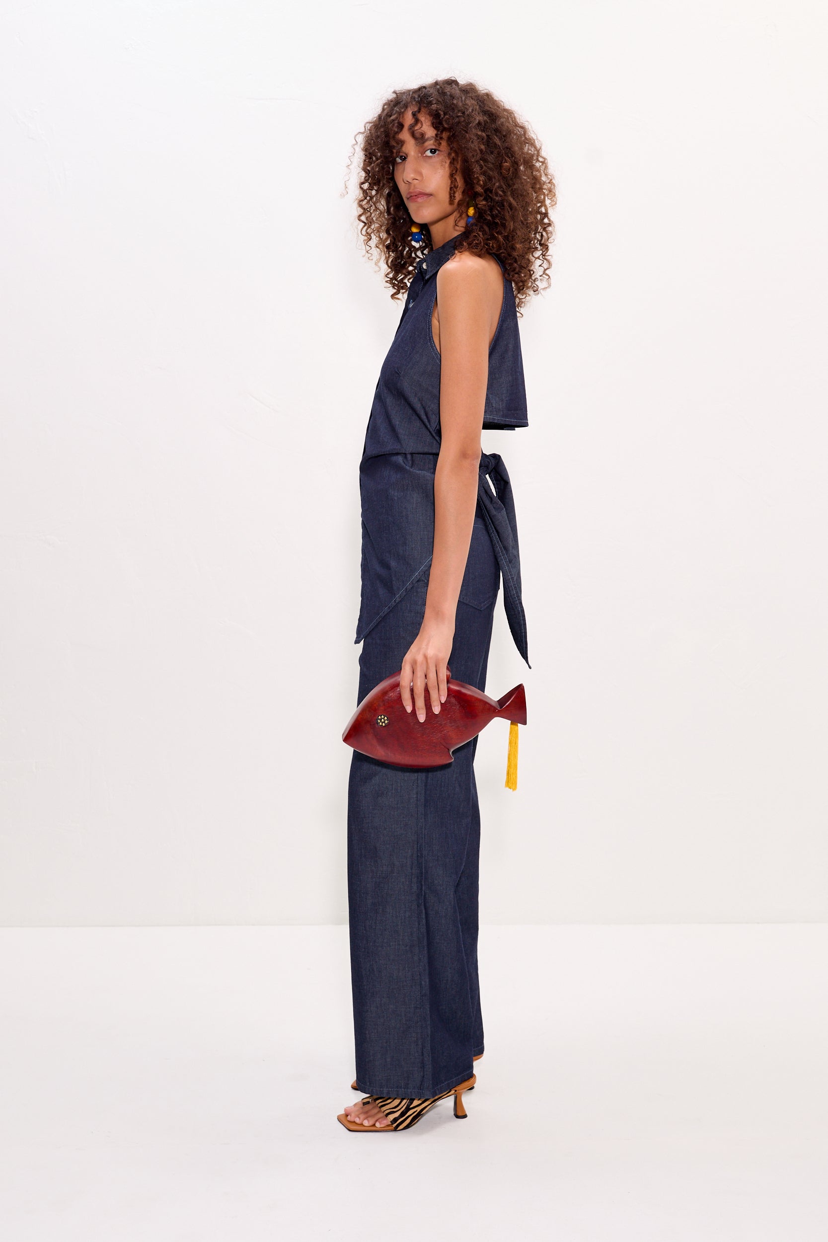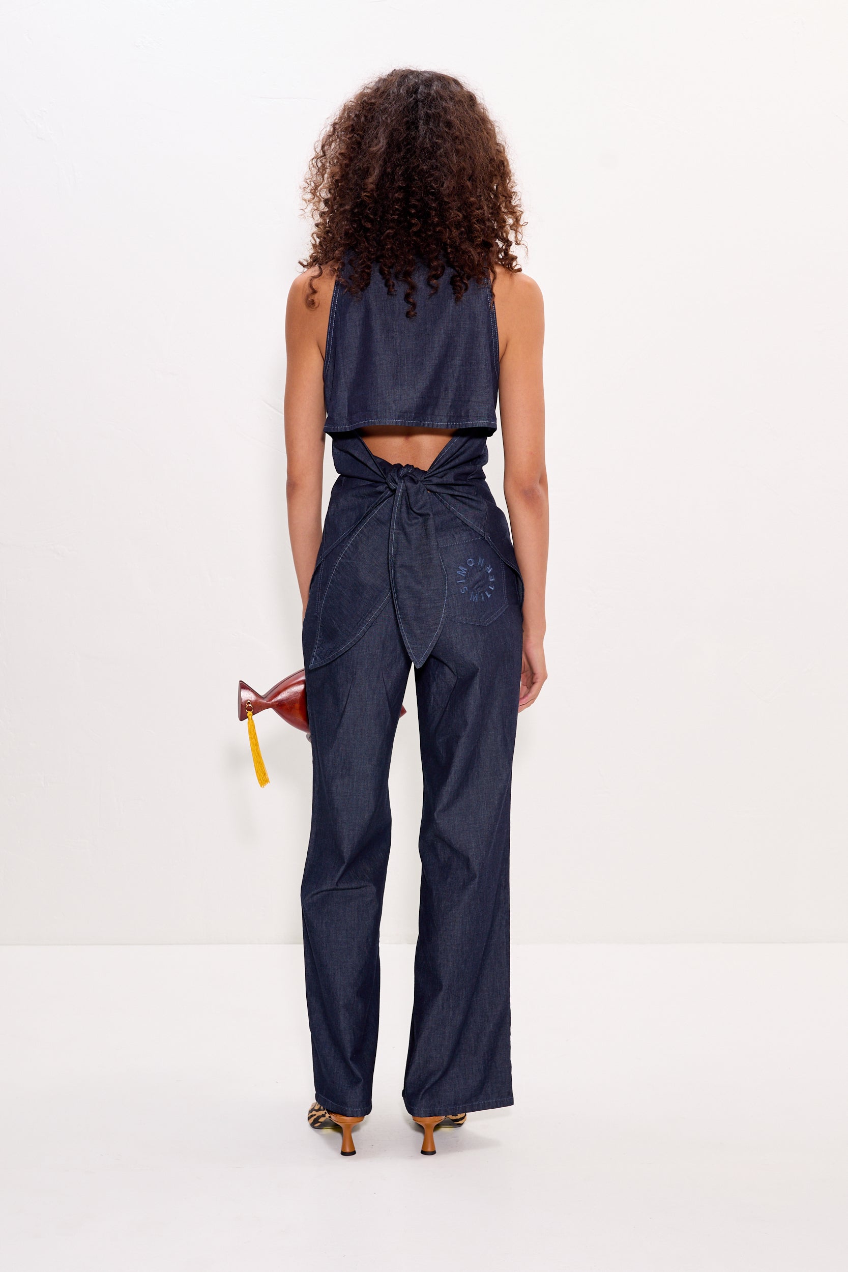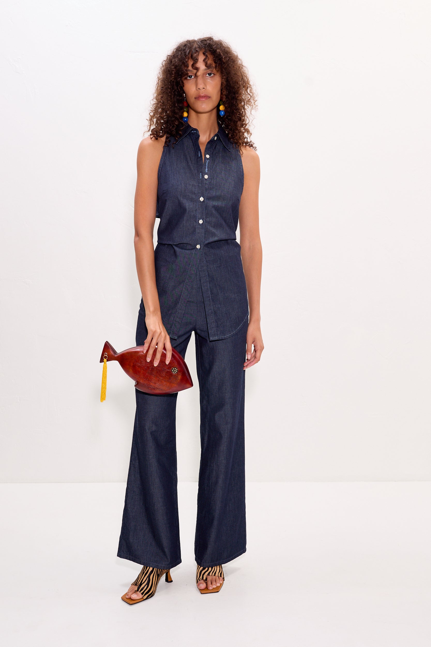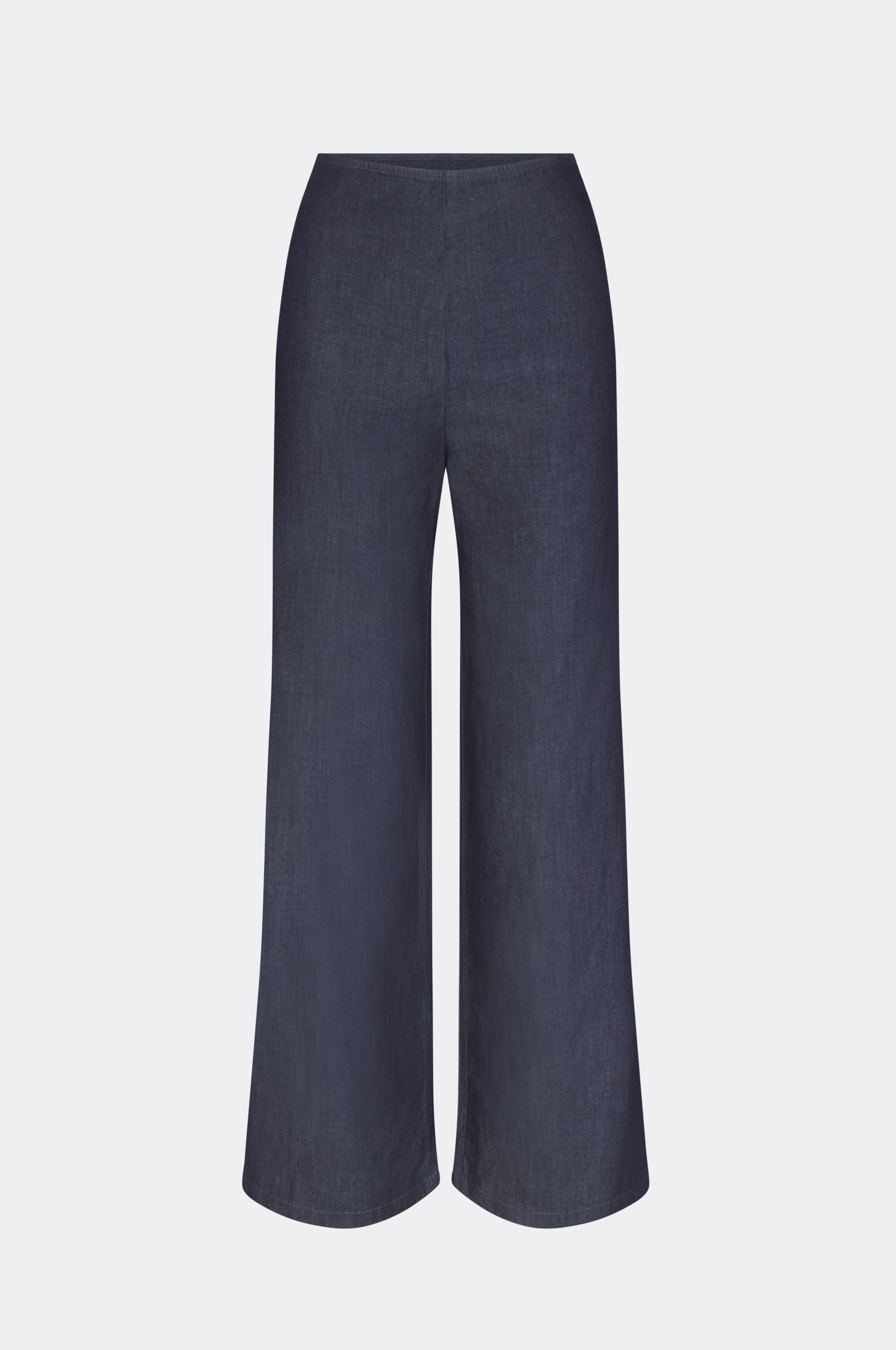 Our bestselling pant returns in a new solid Indigo chambray, featuring a full-length straight leg and mid-rise fit. Designed with a clean front and side zipper for a polished, tailored finish.