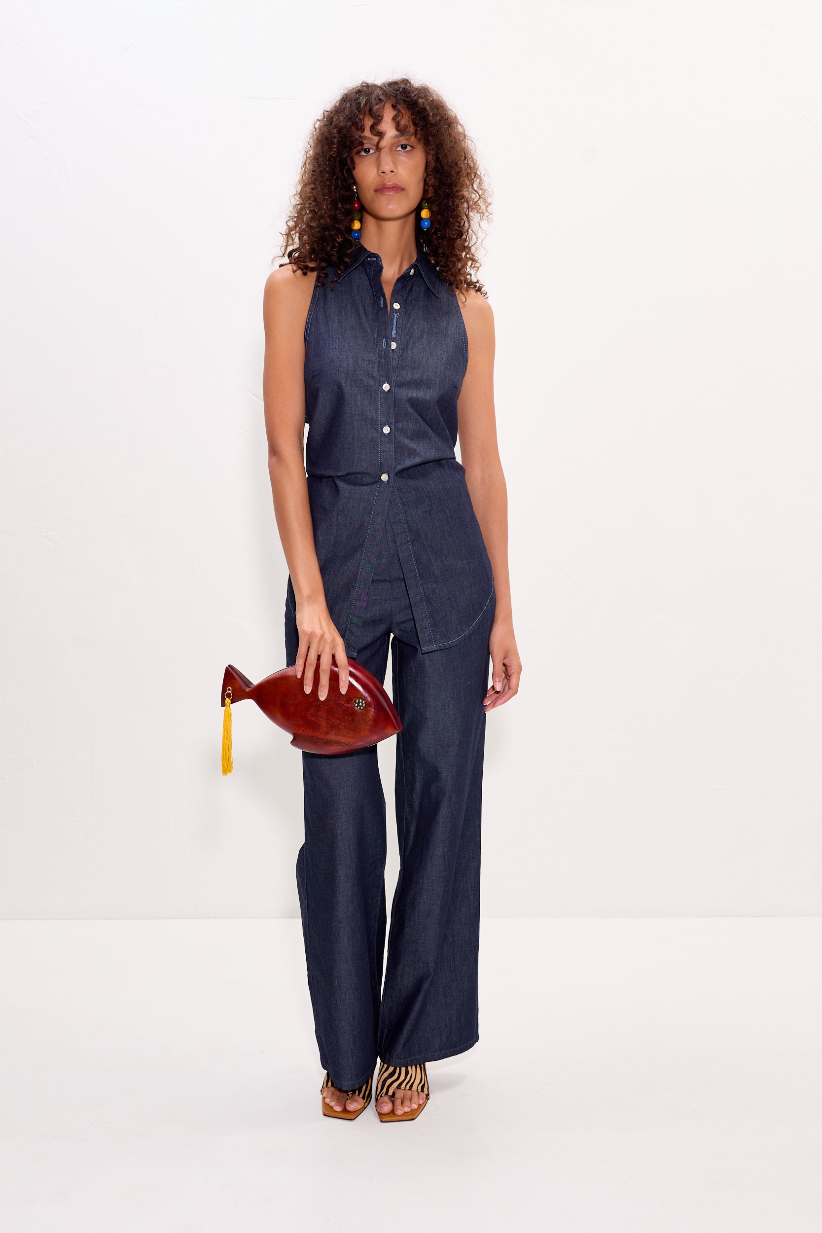 Our bestselling pant returns in a new solid Indigo chambray, featuring a full-length straight leg and mid-rise fit. Designed with a clean front and side zipper for a polished, tailored finish.