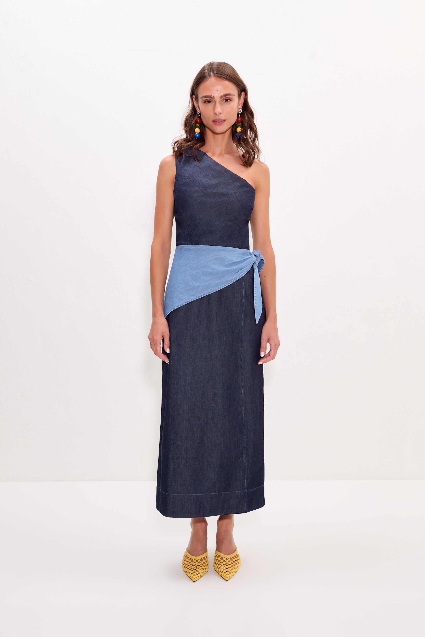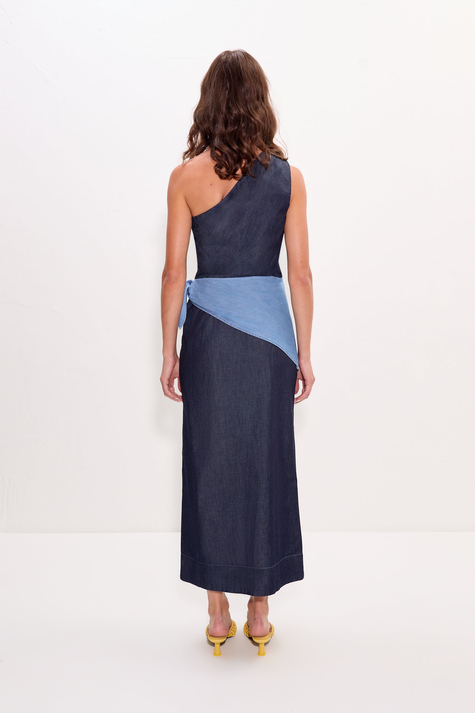 Chambray midi dress with a single-shoulder silhouette. Features a fitted bodice with a contrast waist overlay and adjustable tie to create a flattering, cinched shape.