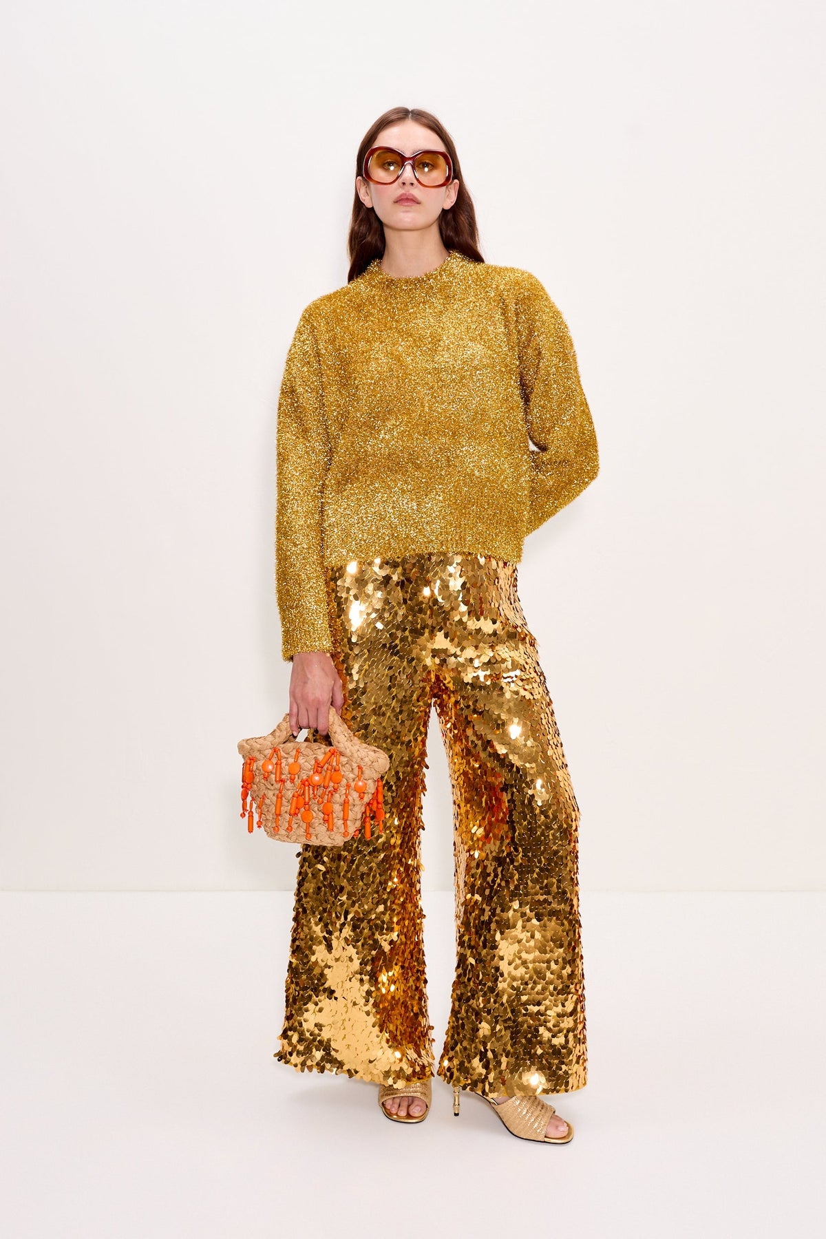 Classic long sleeve knit sweater made from metallic tinsel yarn in Star Gold. Features a fitted silhouette with subtle shimmer throughout.