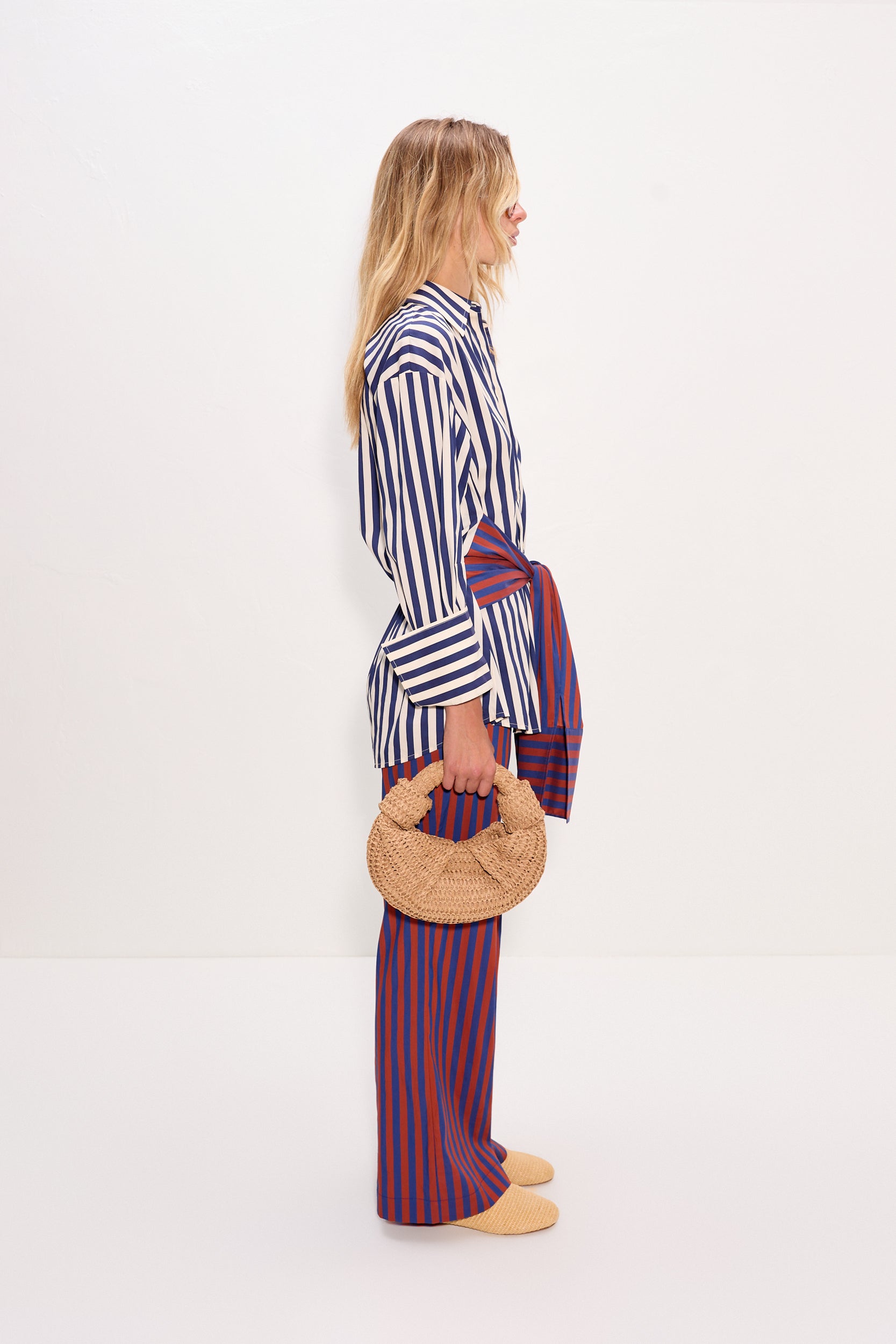 Stretch cotton poplin top in navy stripe multi. Features a cut-out back with adjustable tie for fit flexibility. The ultimate versatile piece to dress up or down.