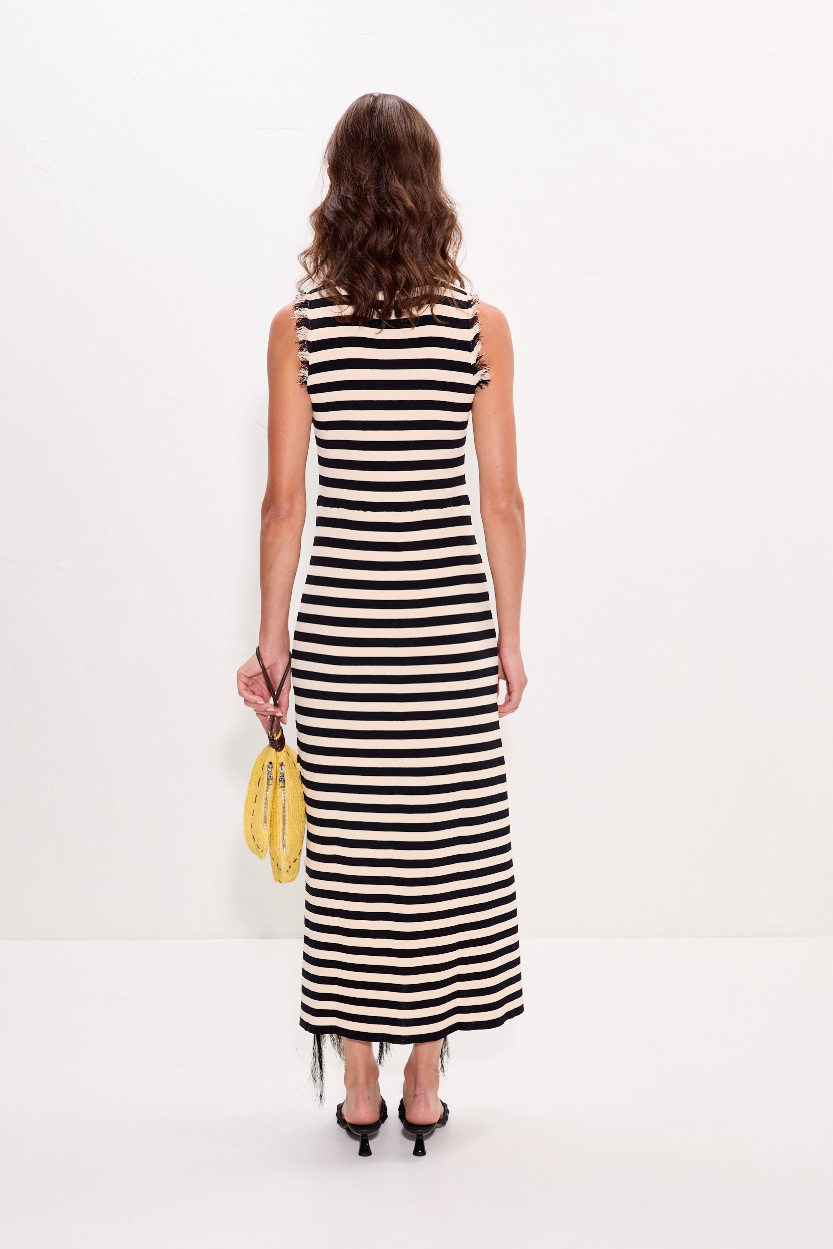 Soft knit midi dress designed with a close, flattering fit through the body. Finished with subtle asymmetrical slits accented by delicate fringe at the slits and armholes for added texture and detail.